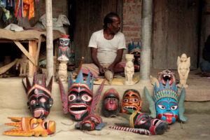 दक्षिण दिनाजपुर : दक्षिण दिनाजपुर जिले के कुष्मंडी प्रखंड के महिशबाथन क्षेत्र की मुखौटा कला प्रदेश समेत पूरे देश में लोकप्रिय है. लोकप्रिय फेस आर्ट की मांग दिन-ब-दिन बढ़ती जा रही है। यह जिले के कुष्मंडी प्रखंड के देउल ग्राम पंचायत के महिशबाथन क्षेत्र में स्थित है. पिछले कुछ सालों में इस फेस इंडस्ट्री के दम पर कई लोगों की रोजी-रोटी का निर्माण हुआ है। ज्ञात हो कि पूर्व में राजबंशी समुदाय के लोग वर्ष के विशेष समय पर धान की कटाई के लिए विशेष पूजा का आयोजन किया करते थे। उस समयविभिन्न देवी-देवताओं के चेहरे पहनकर गंभीर नृत्य किए जाते थे। इसी प्राचीन रिवाज को ध्यान में रखते हुए महिष्बथान क्षेत्र के लोग पीढ़ियों से मुखिया बनाते आ रहे हैं। वर्तमान में मुख की लोकप्रियता आधुनिक युग के साथ बढ़ती जा रही है। दक्षिण दिनाजपुर के कुष्मंडी जिले के महिषबथान का मुहाना पहले से ही जिले से परे राज्य और राज्य से परे विभिन्न देशों में पहुंच गया है। राज्य सरकार की पहल महिष्बथान ग्रामीण हस्त शिल्प केंद्र में क्षेत्र के लोगों को प्रशिक्षण देने से लेकर मुख बनाने से लेकर साल भर बने मुखों की बिक्री तक।मुझे मदद मिलती है। इस संबंध में महिशबाथन क्षेत्र के मुख कलाकार सगुलाल सरकार ने कहा, “मैं कई वर्षों से मुख कला के आधार पर जीवन यापन कर रहा हूं। राज्य सरकार द्वारा आयोजित विभिन्न मेलों से शुरू होकर हमारे मुख देश के विभिन्न बाजारों में पहुंचते हैं। देश और यहां तक कि पड़ोसी देश भी। और यही कारण है कि मुख कला की लोकप्रियता दिन-ब-दिन बढ़ती जा रही है”। गौरतलब है कि वर्तमान राज्य सरकार ने शुरू से ही फेस उद्योग के विकास पर विशेष बल दिया है। मास्टर कलाकारों के प्रशिक्षण से लेकर कला केंद्रों के विकास तकराज्य की मुख्यमंत्री ममता बनर्जी ने कई कदम उठाए हैं। मुख्यमंत्री की पहल पर कुष्मंडी महिशबाथन ग्रामीण हस्तशिल्प केंद्र के भवन को पहले ही डबल डेक किया जा चुका है। कुष्मंडी महिशबाथन ग्रामीण हस्तशिल्प के संपादक परेश चंद्र सरकार ने कहा, “वर्तमान में, कलाकारों के जीवन स्तर में चेहरे की कला के आधार पर बदलाव आया है। हमें उम्मीद है कि भविष्य में कलाकारों में सुधार होगा। राज्य सरकार की पहल से पहले से ही और 2 अंतरराष्ट्रीय संगठनों के साथ दक्षिण दिनाजपुर के जिलाधिकारी बिजिन कृष्णा के प्रयास।समझौता हो गया है। हमें उम्मीद है कि इस लोकप्रिय मुख्य उद्योग को जल्द ही बड़े पैमाने पर विदेशों में निर्यात किया जाएगा। एक बार, इस दूरस्थ क्षेत्र के लोगों को दो दिनों के लिए भोजन प्राप्त करने में मुश्किल होती थी। हालांकि, राज्य के समर्थन से पिछले कुछ वर्षों में मुख्य उद्योग के आधार पर जीवन स्तर में सुधार हुआ है।आखिरकार, दक्षिण दिनाजपुर ज