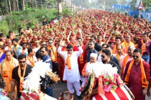 आसनसोल। एक बार फिर औद्योगिक क्षेत्र आसनसोल में मानवीय चेहरा देखने को मिला विशिष्ट समाजसेवी सह व्यवसायी कृष्णा प्रसाद ने एक बार फिर विश्व शांति के उद्देश्य से प्राचीन मंदिरों के जीर्णोद्धार और वृक्षों के संरक्षण के लिए इक्कीस हजार वृक्षारोपण कार्यक्रम के साथ बुद्ध पूर्णिमा के शुभ अवसर पर शुक्रवार को आसनसोल में ऐतिहासिक भव्य कलश यात्रा निकाला गया। कलश यात्रा आसनसोल के कल्ला प्रभु छठ घाट से कलश में जल भरकर शांति का संदेश लेकर लगभग चार हजार महिलाओं ने सिर पर कलश लेकर वापस दोमानी रेलवे कॉलोनी ऊपरपड़ा स्थित शिव मंदिर प्रांगण पहुंचकर। महिलाओं ने शिवलिंग पर जलाभिषेक किया। उस के बाद यज्ञ मंडप में अग्नि प्रवेश व वेदी पूजन के साथ श्रीश्री 24 घंटा अखंड हरिनाम संकीर्तन और जागरण समारोह यहां शुरू हुआ।आज सुबह से प्रभु छठ घाट पर यज्ञाचार्यों द्वारा पवित्र मंत्रों के जाप के साथ कलश में जल भरा गया। इस मौके पर बनारस और देवघर सहित आसनसोल औद्योगिक क्षेत्र के सात विधानसभा क्षेत्रों की करीब चार हजार महिलाएं सिर पर कलश भर कर दोमानी स्थित शिव मंदिर में जलाभिषेक किया।श्रद्धालुओं को महाप्रसाद भोग के रूप में दिया गया। मौके पर कृष्णा प्रसाद ने सभी श्रद्धालुओं सहित पुलिस प्रशासन एवं सहयोगियों को कलश यात्रा सफल रूप से संपन्न के लिए धन्यवाद दिया। इस मौके पर संतोष सिंह,अर्जित राय,आशा शर्मा, टिंकू वर्मा,विजय प्रकाश, शिबू सिंह, पीएन सिंह, राजीव कुशवाहा, शनि प्रसाद, रजनीश पांडेय,सुदीप पांडे सहित काफी संख्या में स्थानीय लोग उपस्थित थे। इस अवसर पर समाजसेवी कृष्णा प्रसाद ने कहा कि आज इस कार्यक्रम को करके उनको आत्मिक संतुष्टि मिली है उन्होंने कहा कि हाल ही में वह बागेश्वर धाम गए थे जहां धीरेंद्र शास्त्री जी से उनकी मुलाकात हुई थी लाखों की भीड़ में भी धीरेंद्र शास्त्री जी ने उनको पहचाना और अचानक उनको एक कार्य सौंपा आज बालाजी धाम में उनके तत्वावधान में एक शेड बन रहा है कृष्णा प्रसाद ने कहा कि यह सब कुछ बागेश्वर धाम जी के आशीर्वाद और उनके माता-पिता के आशीर्वाद से हो रहा है उन्होंने कहा कि जल्दी आसनसोल शिल्पांचल में 151 मंदिरों का निर्माण किया जाएगा उन्होंने कहा कि यहां बागेश्वर धाम जी का भी मंदिर बनेगा जो कि इस पूरे बंगाल में पहला मंदिर होगा उन्होंने कहा कि उनको इस बात की काफी खुशी है कि परमेश्वर ने उनको इस कार्य के लिए चुना है और वह आजीवन इस कार्य को करते रहना चाहते हैं उन्होंने कहा कि बहुत जल्द आसनसोल में प्रदीप मिश्रा जलाया जजाएगा ‌ कृष्णा प्रसाद ने बताया कि विरेंद्र शास्त्री जी खुद बागेश्वर धाम मंदिर का भूमि पूजन करेंगे वही भाजपा नेताओं संतोष सिंह और आशा शर्मा कलश यात्रा में शामिल हुए दोनों ने ही कृ