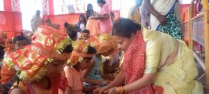 चिरकुंडा।शारदीय नवरात्र की षष्ठी को चिरकुंडा उपर बाजार स्थित दुर्गा मंदिर के पंडाल मे 188 कन्याओ का कन्या पूजन राजद नेत्री व समाजसेवी सुनीता सिंह द्वारा किया गया ।सर्वप्रथम दुर्गा मंदिर के पुरोहित जी से संकल्प कराया गया उसके बाद चिरकुंडा नगर के विभिन्न स्थानो से आई सभी कन्याओ को पंडाल मंडप मे बैठाकर सुनीता सिंह ने अपने सभी सहयोगी के साथ कन्याओ का पैर धोया आलता लगाया हाथो मे मौली सुता बांधा कुमकुम लगाया और सिर पर चुनरी पट्टा बांध कर प्रसाद दक्षिणा देकर सभी कन्याओ से आशीर्वाद प्राप्त किया ।