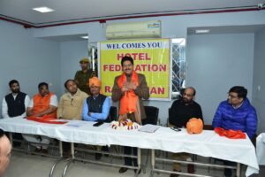 फेडरेशन के संरक्षक सुरेंद्र सिंह ने प्रदेश में पर्यटन क्षेत्र को आगे बढ़ाने के लिए अपने विचार रखे। फेडरेशन के अध्यक्ष हुसैन खान ने कहा कि प्रदेश में आने वाले पर्यटकों को खासी परेशानी का सामना करना पड़ता है। इसे राज्य सरकार और पर्यटक विभाग के सामने रखने और राजस्थान में पर्यटन क्षेत्र में बढ़ोतरी और रोजगार के अवसर लाने पर जोर दिया। इस मौके पर होटल फेडरेशन ऑफ राजस्थान के प्रदेशाध्यक्ष और भाजपा अल्पसंख्यक मोर्चा के राष्ट्रीय उपाध्यक्ष हुसैन खान, वरिष्ठ उपाध्यक्ष रणविजय सिंह, महासचिव शैलेश प्रधान, सह सचिव अंशुल सरावगी, कोषाध्यक्ष संदीप गोगीया, कार्यकारिणी सदस्य क्षितिज शर्मा, देवेन्द्र सिंह, निर्मल शर्मा, जितेन्द्र, श्याम गुप्ता, सीताराम, विपूल वर्मा, अजय शर्मा समेत अन्य पदाधिकारी मौजूद रहे।