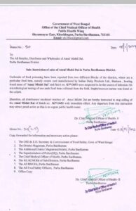 जिला स्वास्थ्य विभाग की ओर से जारी निर्देशिका में कहा गया है कि हाल ही में जिले के दो ब्लाकों में खाद्य विषक्रिया की घटनाएं घटी हैं। देखा गया है कि डेयरी प्रोडक्ट, जिसका ब्रांड नेम अमूल मिष्टी दोई और बैच नंबर केपीडी-3653 है, से ही यह विषक्रिया हुई हैं। इसलिए जिले के समस्त वितरकों एवं खुदरा विक्रेताओं को फिलहाल अमूल मिष्टी दोई की बिक्री रोक देने का निर्देश दिया गया है।