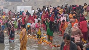 वाराणसी,15 जनवरी । 77 सालों के बाद बने वरीयान और रवि योग के दुर्लभ संयोग में मकर संक्रांति पर्व पर सोमवार को धर्म नगरी काशी में ठंड और हाड़कपा देने वाली गलन के बीच लाखों श्रद्धालुओं ने पतित पावनी गंगा नदी में आस्था की डुबकी लगाई।