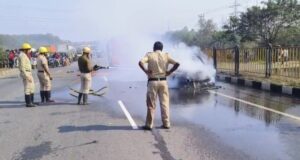 दुर्गापुर में राष्ट्रीय राजमार्ग चलती कार मे लगी भीषण आग,बाल-बाल बचे मां-बेटे