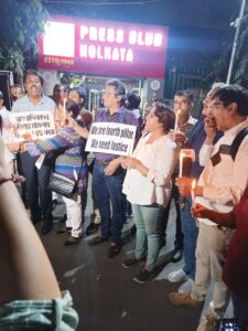 कोलकाता, 21 फरवरी (हि.स.)। पश्चिम बंगाल के हिंसा ग्रस्त संदेशखाली इलाके में लोगों की बदहाली को देशवासियों के सामने लाने के लिए ग्राउंड रिपोर्टिंग कर रहे पत्रकारों पर पुलिस की बर्बरता के खिलाफ आखिरकार कोलकाता का प्रगतिशील राष्ट्रवादी पत्रकार संघ (पीआरपीएस) सड़कों पर उतरा है। करीब सैकड़ो की संख्या में पत्रकारों का समूह सड़कों पर था और प्रशासन की कार्रवाई के खिलाफ नारेबाजी की। पत्रकारों ने काली पट्टी बांध रखी थी और ममता सरकार की मीडिया के खिलाफ इस अवैध कार्रवाई को लेकर नाराजगी जताई। इस प्रदर्शन में नेता प्रतिपक्ष शुभेंदु अधिकारी भी शामिल हुए और पत्रकारों के खिलाफ हिंसक कार्रवाई के खिलाफ मोमबत्ती जलाई। उन्होंने हर संभव मदद का आश्वासन दिया।