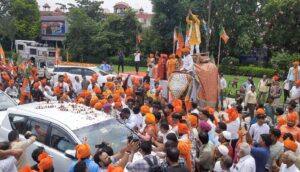 इस दौरान सभी कार्यकर्ता और महिलाएं केसरिया साफों में सजे-धजे नजर आए। विधायक शर्मा स्वयं गजराज हाथी पर खड़े होकर अनोखे अंदाज में नए प्रदेश अघ्यक्ष के कािफले पर पुष्प वर्षा करते रहे। कई कार्यकर्ता रोड के दोनों तरफ मौजूद बुलडोजर पर खड़े होकर फूल बरसाते रहे। स्वागत के समय लगातार झांझ-मंजीरे, ढोल-नगाड़े और डीजे बजते रहे। वहीं मुख्य स्वागत मंच के समीप दूसरे मंच पर महिलाएं मारवाड़ के पारंपिक नृत्य की प्रस्तुति देती रहीं। दोनों मंच भगवा पताकाओं और भाजपा के झंडों से सजे रहे।