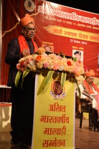 अपने अध्यक्षीय भाषण में राष्ट्रीय अध्यक्ष शिवकुमार लोहिया ने कहा कि जिस प्रकार मारवाड़ी समाज के डीएनए में व्यापार एवं समाज सेवा,उसी प्रकार सम्मेलन के डीएनए में समाज सुधार है। सम्मेलन का पांच सूत्री कार्यक्रम है जिसमें प्रमुख है संस्कार संस्कृति चेतना एवं समाज सुधार एवं आपनो समाज-एक समाज-श्रेष्ठसमाज । समाज के सभी घटकों को अपने सभी रकम की दूरियां पाटकर एकजुट होने की आवश्यकता है और सम्मेलन की स्थापना से ही इस उद्देश्य को लेकर सम्मेलन आगे बढ़ रहा है। आज समाज में नई-नई विसंगतियों एवं कुरीतियों पैदा हो रही है।यह एक चिंताजनक स्थिति है। आज की युवा पीढ़ी में मूल्य बोध का अभाव दिख रहा है। भविष्य के लिए बहुत ही चिंतनीय विषय है। साथ ही साथ समाज में अनेक जगह देखा जाता है कि जागरूकता भी बढ रही है। उन्होंने कहा कि यह मेरा यह दृढ विश्वास है कि सतत प्रयास एवं कर्म में से हम इस बिगड़ी स्थिति को भी सुधार कर पटरी पर लाने के लिए काम कर सकते हैं। उन्होंने मांगलिक समारोह में मद्यपान प्री वेडिंग सूट का प्रदर्शन एवं सड़कों पर महिलाओं का शादी विवाह के अवसर पर नृत्य के विषय में चिंता व्यक्त की । उन्होंने कहा की नई पीढ़ी पश्चात सभ्यता की अंधी नकल करने में लगी है। उन्हें हमारे संस्कार और संस्कृति की विशेषता को तार्किक तरीके से समझा करके उन्हें फिर से इस ओर लाना होगा जब तक हमारी मातृभाषा को हम अपने परिवार में नहीं स्थापित करेंगे तब तक हमारे संस्कार संस्कृति बच नहीं सकती। उन्होंने सभी समाज बंधुओ को आवाहन किया कि सम्मेलन से जुड़े, सम्मेलन की कार्यक्रमों से जुड़े एवं समाज को नई दिशा देने में अपना योगदान दें। पूर्व राष्ट्रीय अध्यक्ष पद्मश्री प्रहलाद राय अग्रवाल ने सम्मेलन के इतिहास को संक्षिप्त रूप में प्रस्तुत किया एवं कहा कि आज की युवा पीढ़ी हालांकि काफी प्रगतिशील है; साथ ही साथ उन्हें हमारे संस्कारों के विषय में भी जानकारी देना हमारा कर्तव्य है। उन्होंने घोषणा की की प्रवीण उद्योगपति एवं समाजसेवी श्री वेणुगोपाल बांगड़ को राजस्थानी व्यक्तित्व पुरस्कार के लिए चयनित किया गया है। पूर्व राष्ट्रीय अध्यक्ष श्री सीताराम शर्मा ने कहा कि सम्मेलन सदैव से ही समाज सुधार के लिए जाना जाता है। मुझे इस बात की खुशी है कि समाज सुधार का कार्यक्रम अभी भी चलाया जा रहा है। उन्होंने पश्चिम बंगाल में एक राजस्थान भवन स्थापित करने की बात कही।
