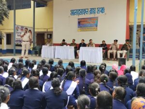 जामुड़िया । जामुड़िया के बोरिंगडांगा स्थित बोरिंगडांगा हाइ स्कूल में जामुड़िया थाना पुलिस तथा जामुड़िया ट्रैफिक पुलिस की ओर से जागरूकता शिविर का आयोजन किया गया।राज्य शिक्षा विभाग के निर्देश पर बोरिंगडांगा हाइ स्कूल में छह दिवसीय स्टूडेंट्स वीक ऑब्जर्वेशन कार्यक्रम के तहत जामुड़िया थाना पुलिस तथा आसनसोल साइबरसेल और महिला पीएस के तत्वाधान में बोरिंगडांगा हाई स्कूल के छात्रों को जागरूक करते हुए सचेतन किया गया।इस दौरान रानीगंज जामुड़िया के सर्किल इंस्पेक्टर सुशांत चटर्जी, जामुड़िया थाना प्रभारी सोमेंद्रनाथ सिंह ठाकुर,जामुड़िया थाना प्रभारी प्रसेनजीत मंडल, साइबर सेल की स्वर्णाली पाल,महिला पीएस की मैत्री ओझा,बोरिंगडांगा हाइ स्कूल की प्रधान शिक्षिका मिठू घोष आदि प्रमुख रूप से मौजूद थे।इस दौरान पुलिस अधिकारियों द्वारा स्कूली छात्रों की वर्तमान आपराधिक गतिविधियों के प्रति सचेत रहने की सलाह दी गई।इसके साथ ही छात्राओं को सड़क के नियम क्या हैं या वाहन चलाते समय क्या नियम हैं इस विषय में जागरूक किया किया तथा दो पहिया वाहन चलते समय में सतर्क रहने की सलाह दी गई।कार्यक्रम के दौरान पुलिस अधिकारियों द्वारा मोबाइल फोन और अज्ञात प्रोफाइल से बचने के लिए सचेत किया गया।इसके अलावा कम उम्र में शादी न करने के प्रति भी जागरूक किया गया।