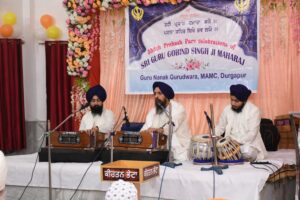 रानीगंज/ श्री गुरु गोविंद सिंह साहेब जी का 358 वा प्रकाश पर्व एमएएमसी दुर्गापुर गुरुद्वारा में मनाया गया। पंजाब से आए हजूरी कीर्तनी रागी जत्था एवं लेक्चर द्वारा गुरु साहिबान की इतिहास की जानकारी संगतो को दी गई। रागी जत्था के द्वारा कीर्तन प्रस्तुत किया गया। इस अवसर पर जगत सुधार गुरुद्वारा बेनाचट्टी के प्रमुख सेवादार सरदार तजेंद्र सिंह बल ने पांडेश्वर के विधायक नरेंद्र नाथ चक्रवर्ती, एडीडीए के अध्यक्ष कवि दत्त एवं महिला पुलिस अधिकारी को सिरोपा पहनाकर सम्मानित किया। गुरुद्वारा के ग्रंथि रणजीत कौर, महासचिव सरदार दलविंदर सिंह सहित भारी संख्या में विभिन्न स्थानों से आए सिख संगत उपस्थित हुए। गुरु का लंगर का आयोजन हुआ।
