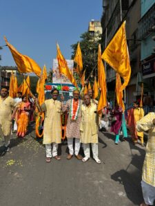 कोलकाता, 27 जनवरी (शंकर जालान)।श्री बिहारीजी मंदिर की ओर से रविवार को तृतीय श्री पुरुषोत्तम ध्वजा यात्रा निकली गई। बाबा भक्त किशोर-मधु सुल्तानिया के नेतृत्व में गोकुल धाम (लेक टाउन) से आरती के बाद जय बाबा की-जय बाबा की के जयघोष के साथ ध्वजा यात्रा निकली। यह भव्य यात्रा जैसेर रोड, पातीपुकुर, बेलगछिया, श्याम बाजार, भूपेन बोस एवेन्यू, शोभा बाजार, बिडन स्ट्रीट, गिरीश पार्क, गणेश टाकीज, माला पाड़ा, जदु मल्लिक होते हुए पाथुरियाघाट स्ट्रीट स्थित श्री बिहारीजी मंदिर पहुंची। जहां आरती के पश्चात ध्वजा को बाबा श्री पुरुषोत्तमदासजी महाराज के श्रीचरणों में अर्पित किया गया। तत्पश्चात भजन-कीर्तन का आयोजन हुआ। गणतंत्र दिवस के मद्देनजर मंदिर परिसर को तिरंगा स्वरूप में सजाया गया था। दर्जनों बाबा सेवकों ने ध्वजा यात्रा में शामिल होकर बाबा का गुणगान किया। मंदिर की तरफ से जारी एक प्रेस विज्ञप्ति में ने बताया कि ध्वजा यात्रा मार्ग पर कई स्थानों पर गर्म व शीतल पेयजल की व्यवस्था की गई थी। पुलिस-प्रशासन का सहयोग सराहनीय रहा।
