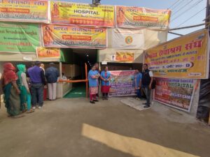 मुझे ऐसा बताते हुए डाक्टर साहब अत्यन्त भावुक हो उठे। पुनः वह दृश्य स्मरण करते ही उनके रोम खड़े हो गये। उन्होंने बताया कि भारत सेवाश्रम संघ तथा गंगा मिशन के तत्वावधान में यह चिकित्सा शिविर कुंभ मेले में गत 11 जनवरी से कार्यरत है, जो 26 फरवरी तक चलेगा। यह सेक्टर फाइव में रामानन्द मार्ग- डी पर अवस्थित है। डाक्टर साहब ने कहा- मैं 26 जनवरी को गया था और 5 फरवरी तक रहा। हमने रोजाना सबेरे 8 बजे से लेकर रात 8 बजे के बीच औसतन 800 रोगियों की चिकित्सा की। इनमें महिला-पुरूष सहित हर उम्र के लोग थे। इसके अलावा आपातकालीन अवस्था में भी हम रोगियों को देखते थे। गंगा मिशन की ओर से पुण्यार्थियों को दिन में तथा रात मे भोजन भी कराया जाता था। इनकी संख्या करीब 800 से 1000 के बीच होती थी। उन्होंने गंगा मिशन शिविर की सम्पूर्ण व्यवस्था का श्रेय माननीय श्री प्रह्लाद राय गोयनका जी को दिया। ज्ञातव्य है कि श्री गोयनका गंगा मिशन के राष्ट्रीय सचिव तथा मारवाड़ी रिलीफ सोसायटी के मानद महासचिव भी हैं। शिविर में सोसाइटी के डाक्टर व नर्से भी सेवा कार्य कर रही हैं। श्री गोयनका ने शिविर में 1 से 10 फरवरी तक भव्य श्री रामकथा का आयोजन भी किया, जिसका श्रद्धालुओं ने भरपूर आनन्द उठाया।