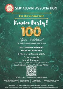 कोलकाता : कोलकाता के बड़ा बाजार में स्थित श्री महेश्वरी विद्यालय के शताब्दी वर्ष पूरे होने पर विद्यालय के भूतपूर्व छात्रों द्वारा मायरा बैंक्विट हॉल में 21 मार्च शुक्रवार 5 बजे से आयोजित करने का निर्णय लिया गया!
