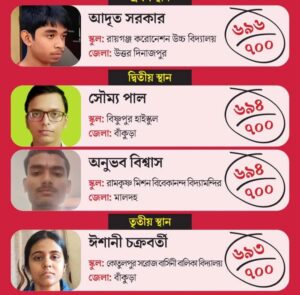 आसनसोल। पश्चिम बंगाल माध्यमिक शिक्षा बोर्ड (WBBSE) कक्षा 10वीं के परिणाम आज, 2 मई 2025 को सुबह 9 बजे घोषित कर दिया है. परिणाम की घोषणा बोर्ड की एड-हॉक समिति के अध्यक्ष द्वारा कोलकाता स्थित निवेदिता भवन, साल्ट लेक के कार्यालय में की है.इस वर्ष 86.56% छात्र-छात्राओं ने माध्यमिक की परीक्षा मे सफलता प्राप्त कर राज्य व अपने अपने जिले का नाम रोशन किया है.आपको बता दे कि इस वर्ष पश्चिम बंगाल 10 वी बोर्ड एग्जाम में 9,84,753 स्टूडेंट्स ने भाग लिया था. इस वर्ष पूरे राज्य में टॉप किया है उत्तरी दिनाजपुर के रायगंज कोरोनेशन उच्च विद्यालय के छात्र आदृत सरकार ने, जिन्होंने 696 अंक प्राप्त कर राज्य में पहला स्थान हासिल किया,द्वितीय स्थान पर संयुक्त रूप से दो छात्र रहे हैं बांकुड़ा जिला के विष्णुपुर हाई स्कूल के सौम्य पाल और मालदा जिला के रामकृष्ण मिशन विवेकानंद विद्यामंदिर के छात्र अनुभव विश्वास,दोनों छात्रों ने 694 अंक प्राप्त किए हैं. वही तृतीय स्थान पर रहीं ईशानी चक्रवर्ती कोतुलपुर सरोज बासिनी बालिका विद्यालय, जिला बांकुड़ा की छात्रा, जिन्होंने 693 अंक हासिल किए। सभी टॉपर्स ने गणित और विज्ञान जैसे विषयों में 100 में से 100 अंक प्राप्त कर यह साबित कर दिया कि मेहनत और लगन से कोई भी लक्ष्य असंभव नहीं है। राज्य भर में छात्रों की इस उपलब्धि पर हर्ष और उत्साह की लहर है। राज्य शिक्षा विभाग की ओर से सभी सफल छात्रों को बधाई दी गई है और उनके उज्ज्वल भविष्य की कामना की गई है। पश्चिम बंगाल बोर्ड कक्षा 10 वीं परिणाम 2025 छात्र आधिकारिक वेबसाइट्स wbresults.nic.in और wbbse.wb.gov.in के साथ-साथ एसएमएस और डिजीलॉकर के माध्यम से देख सकते है।