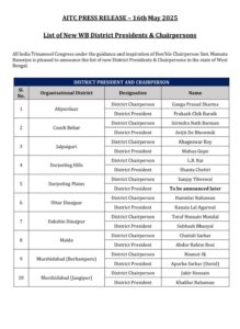 कोलकाता, 16 मई । तृणमूल कांग्रेस ने शुक्रवार को संगठनात्मक ढांचे में बड़ा फेरबदल करते हुए कई जिलों में अध्यक्ष और चेयरपर्सन बदल दिए हैं। लंबे समय से चल रही अटकलों पर अब पार्टी नेतृत्व ने मुहर लगा दी है। बीरभूम और उत्तर कोलकाता जैसे महत्वपूर्ण जिलों में अब जिला अध्यक्ष का पद समाप्त कर, कोर कमिटी को जिम्मेदारी सौंपी गई है। इन कोर कमिटियों में संबंधित जिले के विधायकों को शामिल किया गया है।