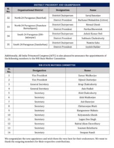 तृणमूल कांग्रेस ने सिर्फ बीरभूम और उत्तर कोलकाता ही नहीं, बल्कि अन्य कई जिलों में भी संगठनात्मक फेरबदल किए हैं। कुछ जगहों पर चेयरपर्सन बदले गए हैं तो कहीं नए अध्यक्ष नियुक्त किए गए हैं।