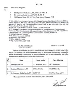 वहीं, वर्तमान डीसीपी (वेस्ट) संदीप कर्रा को कूचबिहार जिले के पुलिस अधीक्षक (SP) पद पर स्थानांतरित किया गया है। इस आदेश के साथ, कूचबिहार के वर्तमान एसपी द्युतिमान भट्टाचार्य को पद से हटाकर सशस्त्र पुलिस बल (SAP) की तीसरी बटालियन का कमांडेंट बनाया गया है।
