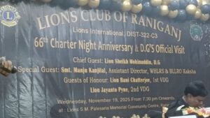 रानीगंज। लायंस क्लब ऑफ़ रानीगंज द्वारा बुधवार की रात क्लब के सभाकक्ष में 66वां चार्टर नाइट का भव्य आयोजन किया गया। क्लब की 66 वर्ष की सेवा यात्रा का जश्न मनाने के लिए आयोजित इस समारोह में बड़ी संख्या में सदस्य और विशिष्ट अतिथि शामिल हुए। कार्यक्रम की शुरुआत केक काटकर की गई, जिसके बाद सभी अतिथियों को सम्मानित किया गया। मुख्य अतिथि के रूप में लायंस क्लब के डी.जी. लायन शेख मोहिनुद्दीन उपस्थित रहे। इसके अलावा 1st VDG लायन बानी चटर्जी, 2nd VDG लायन जयंता पाइन, क्लब अध्यक्ष आलोक बागड़िया,सचिव वाणी खैतान,उपाध्यक्ष डॉक्टर चैताली बसु,कार्यक्रम अध्यक्ष प्रीति खैतान तथा कार्यक्रम संयोजक समीर झुनझुनवाला,राजेश जिंदल समेत सदस्य गण मौजूद थे। अतिथियों और क्लब पदाधिकारियों ने संयुक्त रूप से कहा कि चार्टर नाइट का मुख्य उद्देश्य क्लब की 66 वर्ष की गौरवशाली सेवा यात्रा को याद करना, समाजसेवा के संकल्प को पुनः मजबूत करना तथा सदस्यों में सौहार्द और उत्साह बढ़ाना है।कार्यक्रम के दौरान क्लब की आगामी सेवा योजनाओं और सामाजिक प्रतिबद्धताओं पर भी चर्चा की गई। लायंस क्लब ऑफ़ रानीगंज ने विश्वास दिलाया कि भविष्य में भी समाजहित में उनकी सेवा इसी समर्पण और निष्ठा के साथ जारी रहेगी।