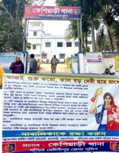 पश्चिम मेदिनीपुर, 01 जनवरी । बाल विवाह जैसी सामाजिक कुरीति पर रोक लगाने और लोगों को कानून के प्रति जागरूक करने के उद्देश्य से केशियाड़ी थाना पुलिस ने गुरुवार को थाना क्षेत्र के विभिन्न इलाकों में व्यापक जन-जागरूकता अभियान चलाया। अभियान के तहत सार्वजनिक स्थलों पर लगभग 70 जागरूकता पोस्टर लगाए गए।