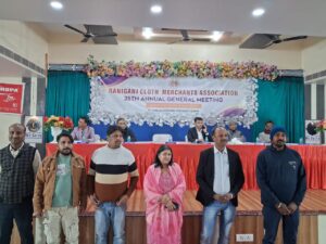 रानीगंज/ रानीगंज क्लॉथ मर्चेंट एसोसिएशन का 35 वा एनुअल जनरल मीटिंग लायंस क्लब मे आयोजित हुआ। कार्यक्रम की अध्यक्षता अनूप सराफ ने किया। इस अवसर पर विशिष्ट अतिथि के रूप में उपस्थित फॉसबेकी के पेट्रन राजेंद्र प्रसाद खेतान, रानीगंज चेंबर ऑफ कॉमर्स के प्रेसिडेंट रोहित खेतान, क्लॉथ मर्चेट के प्रेसिडेंट संदीप सोमानी, सहित कई गणमान्य लोग उपस्थित थे। इस अवसर पर मुख्य अतिथि आसनसोल दुर्गापुर विकास प्राधिकरण के चेयरमैन कवि दत्ता को विशेष रूप से सम्मानित किया गया एवं रानीगंज के विभिन्न समस्याओं को लेकर एक मेमोरेंडम सोपा गया। मेमोरेंडम में मुख्य मांगे रानीगंज शहर में पार्किंग की व्यवस्था,अर्बन ब्यूटीफिकेशन, रानीसर गिरजा पारा बाईपास सड़क को चौड़ाकरण की मांग, रानीगंज शहर में बिल्डिंग प्लान को लेकर जो सुविधा आ रही है उसे समस्या का निदान किया जाए । संस्था की तरफ से संजय खेतान, गोपीचंद मोर, सलिल कुमार सिन्हा, ने संस्था द्वारा की जारी गतिविधियों की जानकारी दी। इस मौके पर सांस्कृतिक कार्यक्रम का आयोजन हुआ।