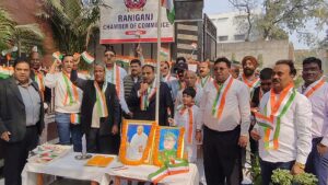 रानीगंज। रानीगंज चेम्बर ऑफ कॉमर्स की ओर से चेम्बर परिसर में 77वां गणतंत्र दिवस पूरे उत्साह और गरिमा के साथ पालन किया गया। कार्यक्रम की शुरुआत स्वतंत्रता सेनानियों को माल्यार्पण एवं पुष्पांजलि अर्पित कर उन्हें श्रद्धांजलि देने के साथ हुई। इसके पश्चात चेम्बर के पदाधिकारियों एवं सदस्यों ने राष्ट्रीय ध्वज फहराया और सामूहिक रूप से राष्ट्रगान गाकर देश के प्रति अपनी श्रद्धा और सम्मान प्रकट किया। इस अवसर पर चेम्बर ऑफ कॉमर्स की ओर से नए वर्ष का कैलेंडर भी जारी किया गया।