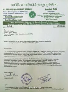 आसनसोल। पश्चिम बंगाल राज्य एआईएमआईएम नेता एवं पश्चिम बर्धमान जिला एआईएमआईएम अध्यक्ष दानिश अज़ीज़ के नेतृत्व में एआईएमआईएम का एक प्रतिनिधिमंडल आसनसोल–दुर्गापुर पुलिस कमिश्नरेट अंतर्गत हीरापुर पुलिस स्टेशन पहुँचा। जहाँ एआईएमआईएम प्रतिनिधिमंडल ने आसनसोल दक्षिण की भाजपा विधायक अग्निमित्रा पॉल के खिलाफ़ FIR दर्ज कराने के उद्देश्य से पुलिस को ज्ञापन सौंपा। एआईएमआईएम नेताओं का आरोप है कि विधायक अग्निमित्रा पॉल ने विधानसभा और अपने सार्वजनिक भाषणों में मदरसा शिक्षा को लेकर अपमानजनक और आपत्तिजनक टिप्पणियाँ की हैं, जिससे अल्पसंख्यक समुदाय की भावनाएँ आहत हुई हैं। प्रतिनिधिमंडल ने इसे संविधान के मूल्यों और सामाजिक सौहार्द के खिलाफ़ बताया। वही इस मामले को लेकर एआईएमआईएम का एक प्रतिनिधिमंडल