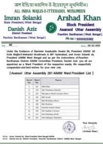 आसनसोल। पश्चिम बंगाल राज्य एआईएमआईएम नेतृत्व और पश्चिम बर्धमान जिला एआईएमआईएम कमेटी के अध्यक्ष दानिश अज़ीज़ की अगुवाई में आज आसनसोल उत्तर विधानसभा क्षेत्र में संगठनात्मक मजबूती की दिशा में एक अहम कदम उठाया गया। आसनसोल के
