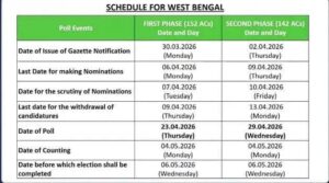 आसनसोल। पश्चिम बंगाल में आगामी विधानसभा चुनाव को लेकर चुनाव आयोग ने चुनाव कार्यक्रम घोषित कर दिया है। राज्य में मतदान दो चरणों में कराया जाएगा। पहले चरण में 23 अप्रैल 2026 को वोटिंग होगी, जबकि दूसरे चरण का मतदान 29 अप्रैल 2026 को संपन्न कराया जाएगा। चुनाव कार्यक्रम घोषित होते ही राज्य में राजनीतिक सरगर्मियां तेज हो गई हैं और सभी दल चुनावी तैयारियों में जुट गए हैं। घोषित कार्यक्रम के अनुसार पहले चरण में राज्य के 152 विधानसभा क्षेत्रों में मतदान कराया जाएगा, जबकि दूसरे चरण में 142 विधानसभा सीटों पर वोट डाले जाएंगे। चुनाव प्रक्रिया की शुरुआत गजट नोटिफिकेशन जारी होने के साथ होगी। पहले चरण के लिए गजट नोटिफिकेशन 30 मार्च 2026 को जारी किया जाएगा, जबकि दूसरे चरण के लिए 2 अप्रैल 2026 को अधिसूचना जारी होगी।पहले चरण के लिए नामांकन दाखिल करने की अंतिम तिथि 6 अप्रैल 2026 निर्धारित की गई है। नामांकन पत्रों की जांच 7 अप्रैल को होगी और उम्मीदवारों के नाम वापस लेने की अंतिम तिथि 9 अप्रैल रखी गई है। वहीं दूसरे चरण के लिए नामांकन की अंतिम तिथि 9 अप्रैल, नामांकन पत्रों की जांच 10 अप्रैल और नाम वापसी की अंतिम तिथि 13 अप्रैल तय की गई है। दोनों चरणों में पड़े वोटों की मतगणना 4 मई 2026 को की जाएगी, जबकि पूरी चुनाव प्रक्रिया 6 मई 2026 तक पूरी कर ली जाएगी। इधर पश्चिम बर्दवान जिले की सभी 9 विधानसभा सीटों पर पहले चरण के तहत 23 अप्रैल को मतदान होगा। इन सीटों में पांडेश्वर, दुर्गापुर पूर्व, दुर्गापुर पश्चिम, रानीगंज, जामुड़िया, आसनसोल दक्षिण, आसनसोल उत्तर, कुल्टी और बाराबनी विधानसभा क्षेत्र शामिल हैं। चुनाव की तारीख घोषित होते ही इन क्षेत्रों में भी राजनीतिक गतिविधियां तेज हो गई हैं और विभिन्न दलों ने अपनी चुनावी रणनीति को अंतिम रूप देना शुरू कर दिया है।
