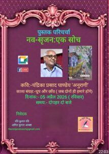 कोलकाता, 5 अप्रैल 2026। साहित्यिक संस्था “नव-सृजन: एक सोच” के तत्वावधान में रविवार को एक ऑनलाइन पुस्तक परिचर्चा का सफल आयोजन किया गया। कार्यक्रम के केंद्र में वरिष्ठ कवि चंद्रिका प्रसाद पाण्डेय ‘अनुरागी’ का काव्य संग्रह “धूप और छाँव जब दोनों ही हमारे होंगे” रहा।