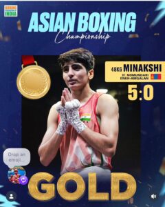 उलानबटोर (मंगोलिया): एशियन बॉक्सिंग चैंपियनशिप में भारतीय महिला मुक्केबाज मीनाक्षी हुड्डा ने शानदार प्रदर्शन करते हुए स्वर्ण पदक जीतकर देश का गौरव बढ़ाया है। उनकी इस ऐतिहासिक उपलब्धि ने अंतरराष्ट्रीय मंच पर भारत का तिरंगा शान से लहराया।