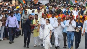 दुर्गापुर। पश्चिम बंगाल विधानसभा चुनाव को लेकर सियासी सरगर्मी के बीच तृणमूल कांग्रेस ने शुक्रवार को औद्योगिक नगरी दुर्गापुर में अपनी ताकत का भव्य प्रदर्शन किया। पार्टी सुप्रीमो एवं मुख्यमंत्री ममता बनर्जी के नेतृत्व में निकली विशाल पदयात्रा ने पूरे शहर को चुनावी रंग में रंग दिया। दुर्गापुर के स्टील मार्केट पांच माथा मोड़ से भिरिंगी टी.एन. स्कूल तक आयोजित इस पदयात्रा में हजारों की संख्या में पार्टी कार्यकर्ता, समर्थक और आम नागरिक शामिल हुए। सड़कों पर उमड़ी भीड़ ने इसे जनसैलाब का रूप दे दिया। हर कदम पर बढ़ती भीड़ ने यह संकेत दिया कि तृणमूल कांग्रेस चुनावी मैदान में पूरी मजबूती के साथ उतर चुकी है। इस दौरान ममता बनर्जी ने दुर्गापुर पश्चिम से पार्टी प्रत्याशी कवि दत्त और दुर्गापुर पूर्व से प्रत्याशी प्रदीप मजूमदार के समर्थन में लोगों से अपील की। उन्होंने जनता से दोनों उम्मीदवारों को भारी मतों से विजयी बनाने का आह्वान किया। पदयात्रा के दौरान पूरे मार्ग में पार्टी के झंडे, नारों की गूंज और समर्थकों के जोश ने माहौल को पूरी तरह चुनावी बना दिया। जगह-जगह लोगों ने मुख्यमंत्री का स्वागत किया और समर्थन का भरोसा जताया। राजनीतिक विश्लेषकों का मानना है कि दुर्गापुर की सड़कों पर उमड़ी यह भारी भीड़ तृणमूल कांग्रेस की मजबूत संगठनात्मक पकड़ और जनाधार को दर्शाती है। यह शक्ति प्रदर्शन आगामी विधानसभा चुनाव में पार्टी की सशक्त दावेदारी का संकेत भी माना जा रहा है। फिलहाल, राज्य में चुनावी गतिविधियां तेज हो गई हैं और विभिन्न राजनीतिक दल जनता को अपने पक्ष में करने के लिए लगातार जनसंपर्क और रैलियों का आयोजन कर रहे हैं।