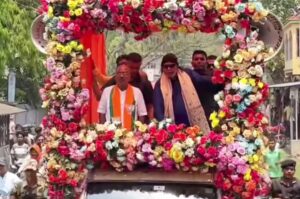 इस मेगा रोड शो में बॉलीवुड के महानायक मिथुन चक्रवर्ती की विशेष उपस्थिति ने कार्यक्रम को अभूतपूर्व ऊर्जा और आकर्षण प्रदान किया। खुली गाड़ी में सवार मिथुन चक्रवर्ती का स्वागत करने के लिए हजारों की संख्या में समर्थक सड़कों पर उमड़ पड़े। जगह-जगह फूलों की वर्षा, जयघोष और नारों से पूरा मार्ग गूंज उठा।